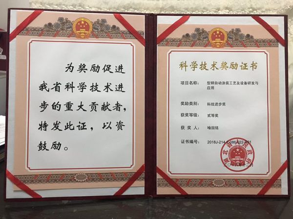 4月26日,湖北省科学技术奖励暨科技创新推进大会在洪山礼堂隆重召开。大会隆重表彰了2018年度获得湖北省科学技术奖的单位和个人,宣读了省人民政府《关于2018年度科学技术奖励的决定》。公司喻国铭教授主持完成的《型钢自动涂装工艺及设备研发与应用》荣获2018年度湖北省科技进步二等奖,受到省政府表彰。