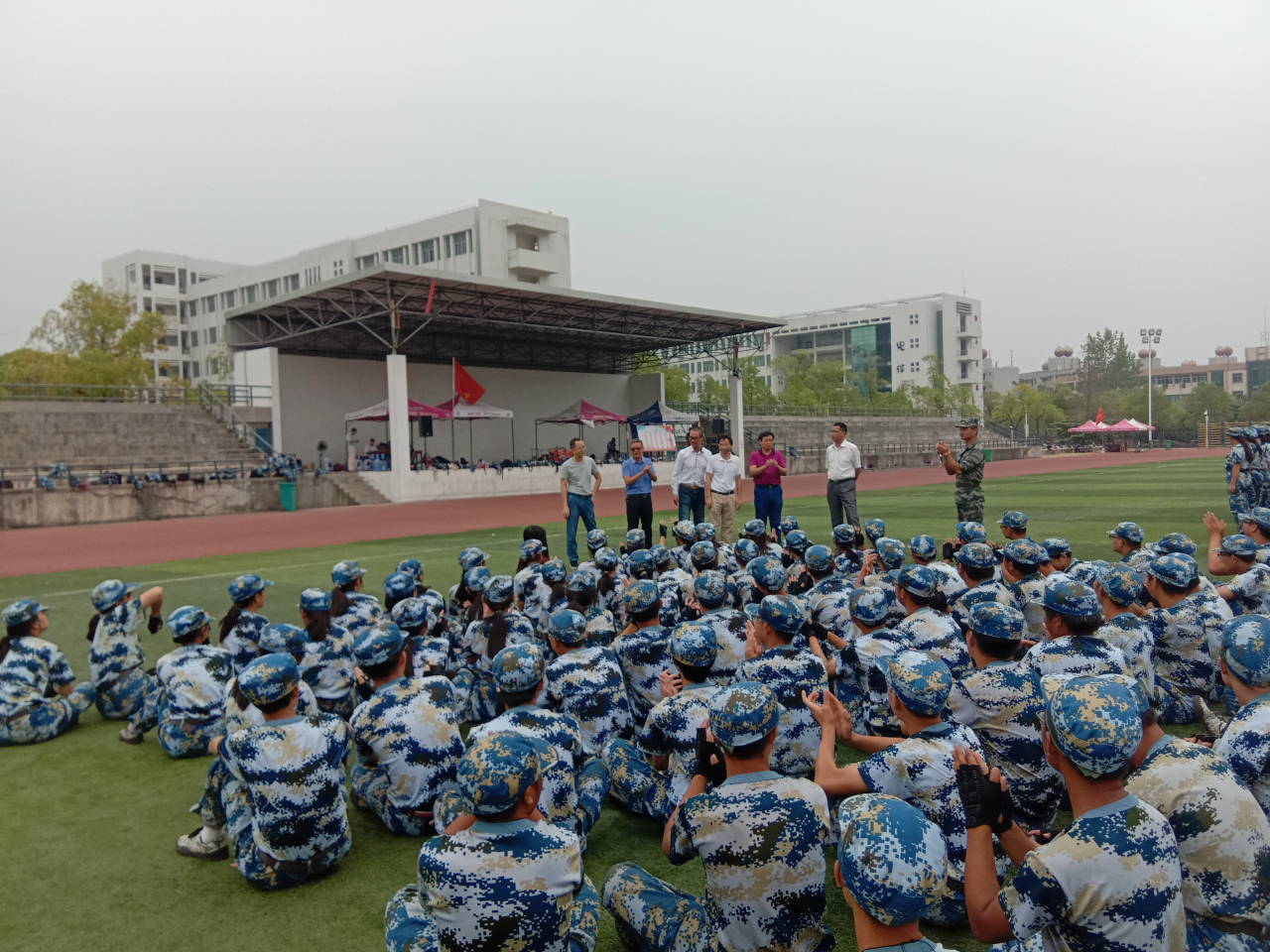 运动场上,同学们精神饱满,斗志昂扬,踏着整齐划一的步子,喊着嘹亮的口号,尽情展现青春风采。各位领导老师认真观看了新生们的军训,和员工亲切地打了招呼,向每位员工以及在场几位员工的家长表达诚挚的问候,并和各位教官一一握手,表示对他们工作的肯定。