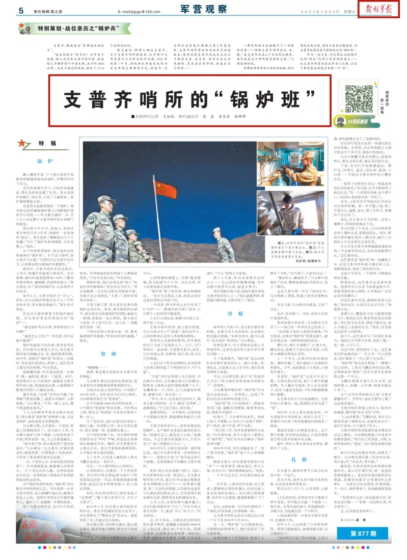 近日,《解放军报》军营观察第5版以《支普齐哨所的“锅炉班”》为题,报道了公司数控专业2015届毕业生何光荣及一直坚守在祖国边疆的人民子弟兵不怕苦、不怕死,忠诚于党、保家卫国的光荣而感人的事迹。文章以“锅炉”“界碑”“冷暖”“扎根”等四个关键词,诠释了他们用生命践行使命,用使命篆刻忠诚,以满腔热忱和无畏情怀,兑现了对党忠诚、服务人民的庄严承诺。下面我们一起看看他的感人事迹吧。
