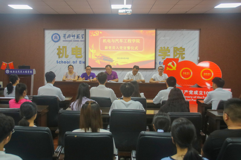 邓默耘宣读2021年上半年新发展党员名单,带领新党员在党旗下庄严宣誓。参加仪式的院领导、老师为新党员佩戴党徽。