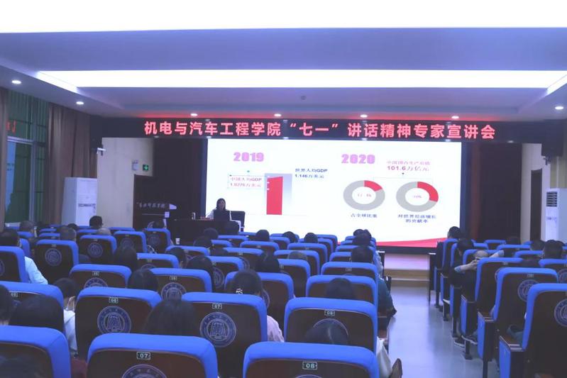 2021年10月14日,机电与汽车工程公司在致远楼三楼报告厅举办习总书记“七一”重要讲话精神专家宣讲会。公司全体院领导、教师出席宣讲会,公司2021年第三期入党积极分子培训班全体学员参加宣讲会。此次宣讲会由公司党委书记郭朝东主持,马克思主义公司李莉教授讲授。