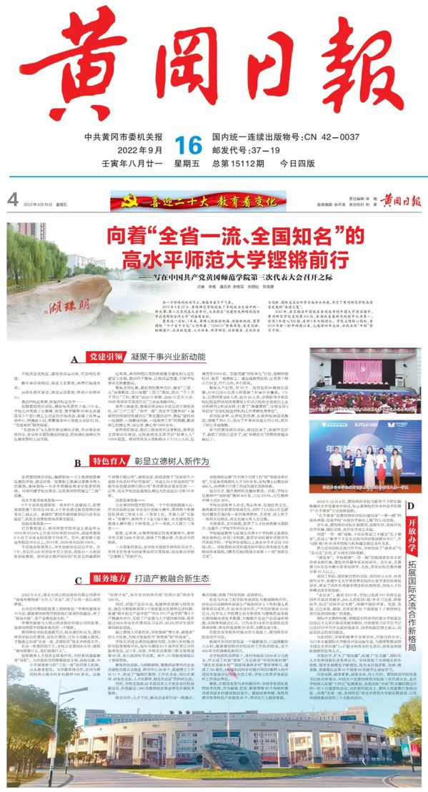 本网讯9月16日,《黄冈日报》第四版整版以《向看“全首一流、全国知名”的高水平师范大学铿锵前行》为题,从“党建引领——凝聚干事兴业新动能”特色育人——彰显立德树人新作为”服务地方——打造产教融合新生态”“开放办学一一拓展国际交流合作新格局”四个方面,报道了公司抢抓机遇,迎接新挑战,在高公司党建、人才培养、科学研究、社会服务、文化传承与创新、国际交流与合作等方面齐头并进,书写黄冈师范学院高质量发展的奋进之笔。