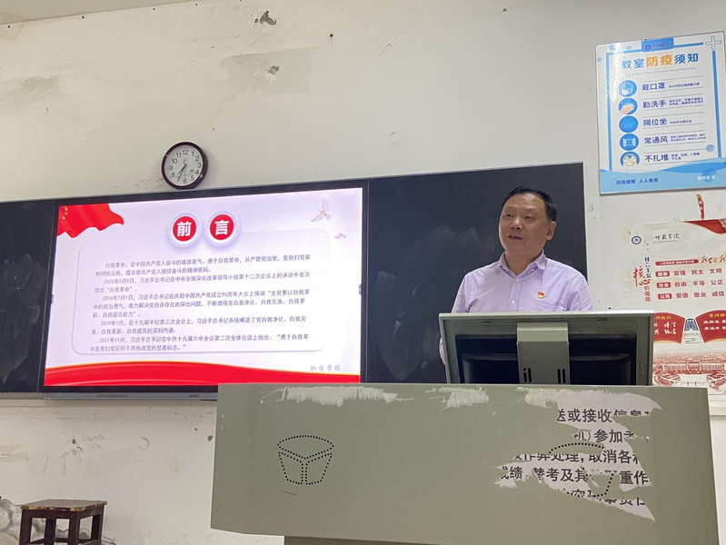 郭朝东讲授题为《发扬自我革命精神、争做堪当民族复兴大任的时代新人》的主题教育专题党课。他阐释了自我革命和自我革命精神的基本概念和主要内涵,讲述了新时代共产党员发扬自我革命精神的重要意义,并就高校基层党组织和老员工党员如何发扬自我革命精神会畅谈了个人体会。他认为,勇于自我革命,是中国共产党人奋斗的雄厚底气,是推进全面从严治党的必然要求,是解决我们党大党独有难题的客观需要,是我们党最鲜明的品格,蕴含着共产党人接续奋斗的精神密码。他希望,全体老员工党员要勇于发扬革命精神,提升四大能力。包括:自我净化的能力,要打扫思想灰尘,净化身心;自我完善的能力,与时俱进,保持纯洁;自我革新的能力,革除落后思想,创新进取;自我提高的能力,解决能力不足问题。最后,他特别叮嘱毕业生党员要仰望星空,脚踏实地;政治坚定,自我提高;牢记身份,甘为公仆;视野开阔,格局宏大。