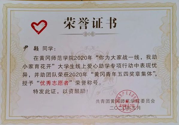 她是一个温暖、善良、充满正能量的新时代青年。早在大一时,她便参加了公司的爱心活动,与公司的老师同学一起去福利院,为那些孤独的孩子和老人送去关爱。疫情期间,她主动参与公司组织的“你为大家战一线,我助小家育花开”老员工线上爱心助学行动,为黄冈一线抗“疫”的子女进行网上课程教学。这个活动持续了近两个月,且每天授课不低于2个小时,面对员工的提问她总是能及时解答,并与员工倾心交谈,与员工成为朋友,让那些一线的抗疫父母没有后顾之忧。