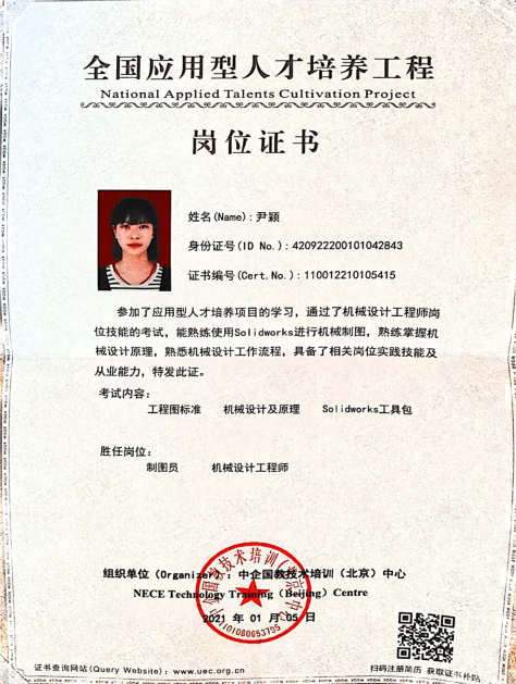 青春气贯长虹,进取压倒苟安。尹颖深知在最美好的岁月里应该多做一些有意义的事。在大公司园里,要抓住机会去丰富自己的知识面。为了扩充自己的知识库,她选修了第二学位——国际经济与贸易,她认为仅仅只学习机械的理论知识是远远不够的,要学会以经济思维来考虑本专业的创新制造,更好地为国家2025智能制造献出自己的一份力量。