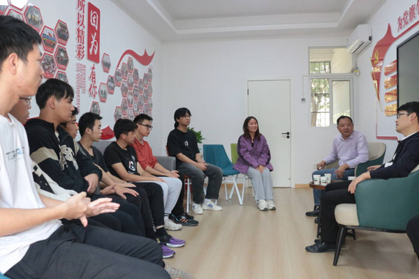 在兰园十栋“一站式”员工社区,胡国珍看望了正在辅导员工作室上班的辅导员老师,并与公司员工党员代表、员工社团负责人、少数民族员工代表和313寝室全体同学座谈。同学们分别介绍了自己目前的学业、学科竞赛、考研实习等情况。