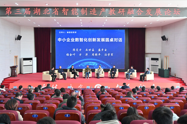 湖北中科产业技术研究院经理喻国铭教授主持论坛对话交流会。欧洲科公司院士、武汉理工大学陈定方教授、武汉大学巫世晶教授、武汉理工大学盛步云教授、黄冈市科技局局长杨金叶、黄冈市经济与信息化局副局长方洋、湖北兴和电力新材料股份公司董事长周锦平、湖北鸣利来合金钻具有限公司董事长汪学军,就智能制造产教研融合发展的理论、技术、政策及其实践等问题,与现场参会人员进行了互动交流。