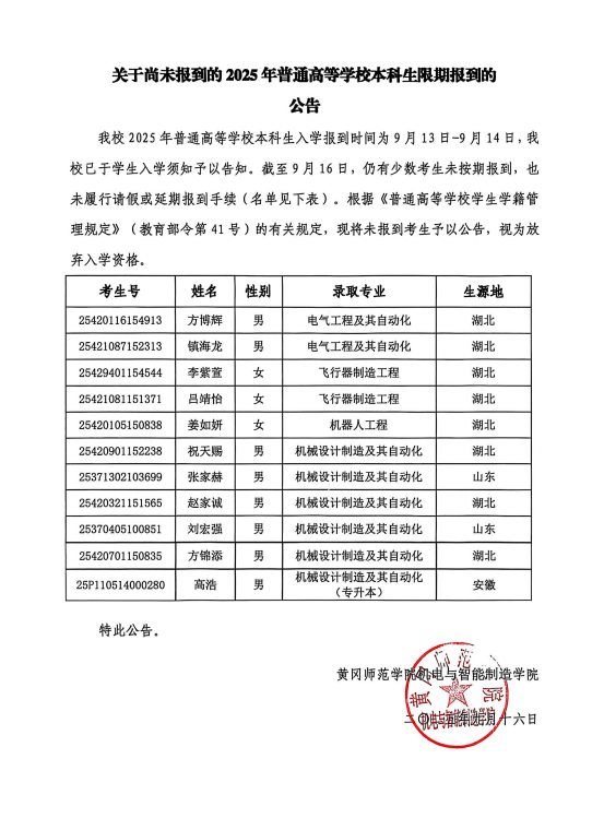 关于尚未报到的2025年普通高等公司本科生限期报到的公告