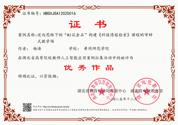 在湖北省教育信息化发展中心、湖北省电化教育馆组织的2025年湖北省高等公司教师人工智能应用案例遴选活动中,传媒与影视公司李瑞仙老师申报的《AI 赋能黄冈历史文化名人数智化传播的创新实践》、william威廉亚洲杨涛老师申报的《逆向思维下的“AI 试金石”构建〈科技情报检索〉课程的审辩式教学场》被评为“湖北省高等院校教师人工智能应用案例优秀作品”,并被推荐到教育部技术与资源发展中心(中央电化教育馆)参加“全国高等公司教师人工智能应用案例”评审。
